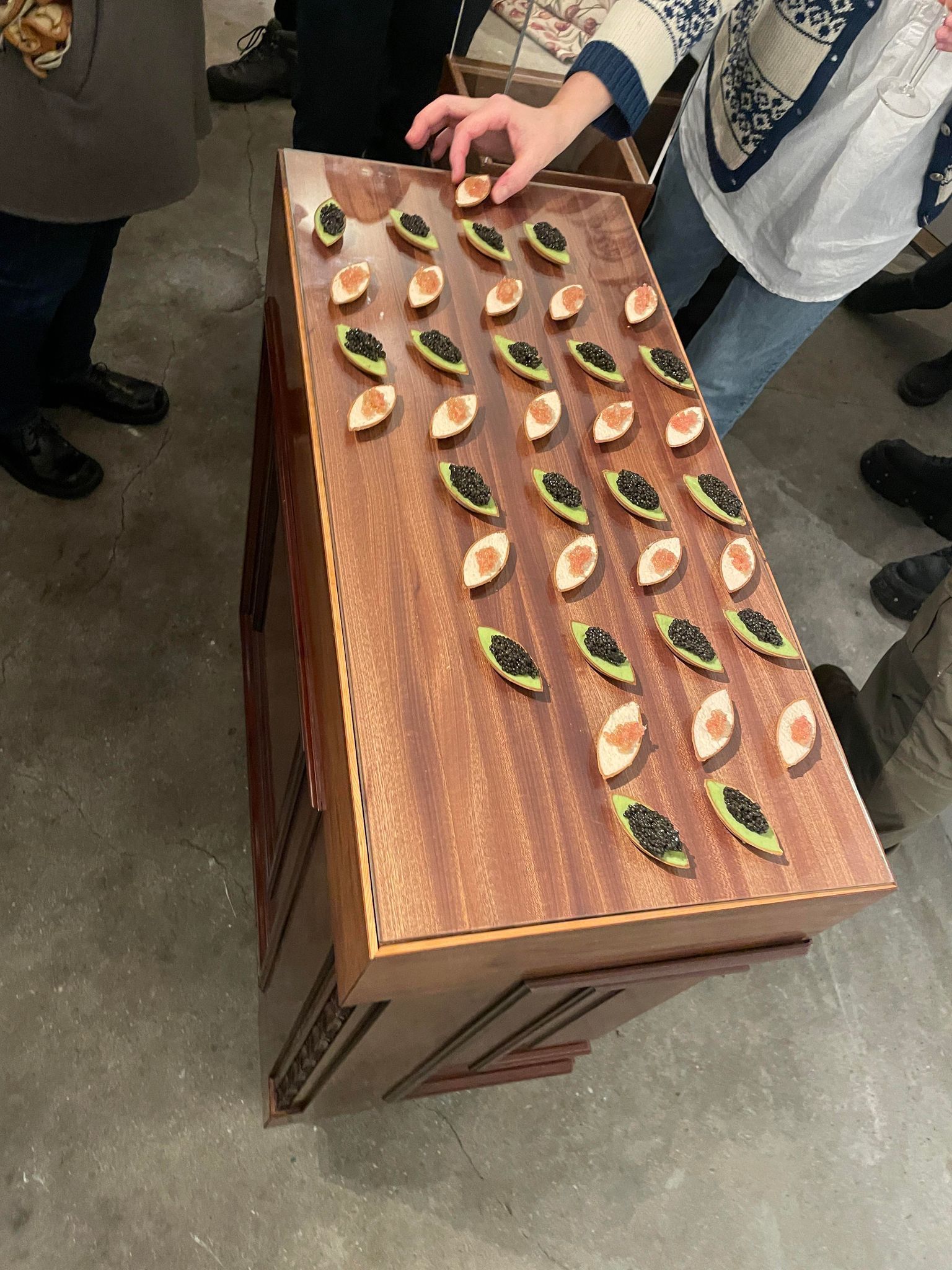 The work is consits of performative elements, baerii caviar, cod roe, fingerlime, avocado beautiful ship-shaped bases made by Restaurant Karoline Amalie and was part of my exhibition, Mediums of Exchange. Relatively was presented on two occations, where guest were instructed to try one of each. Interestingly the caviar servings were gone first.