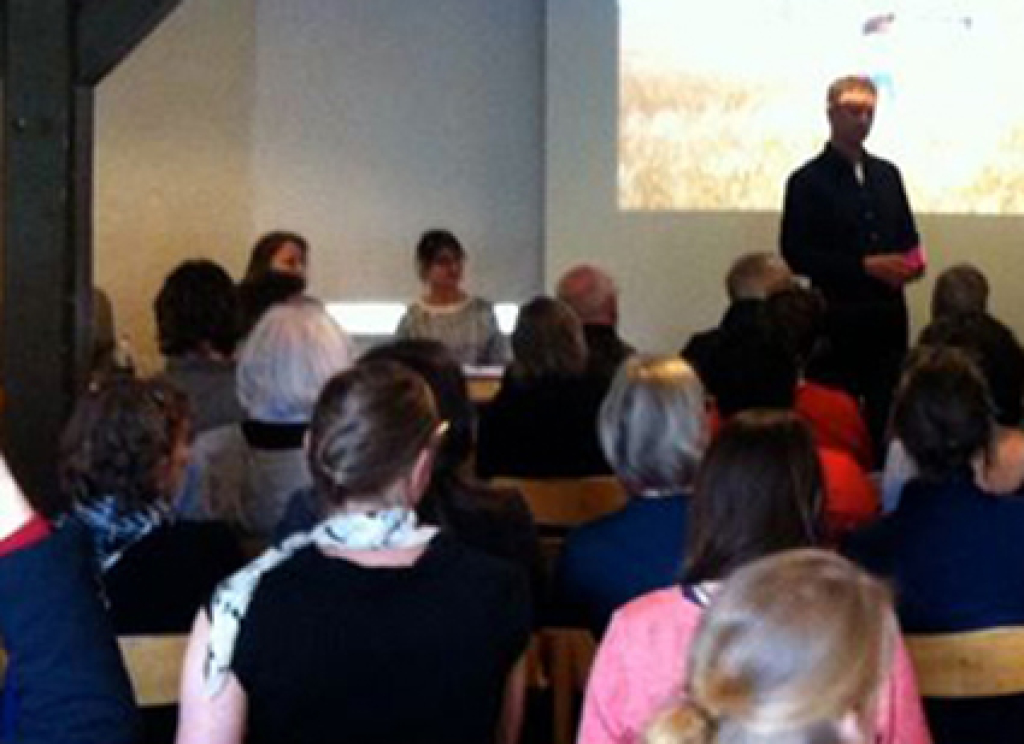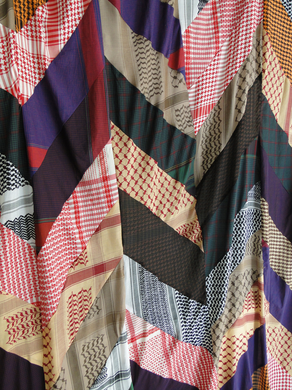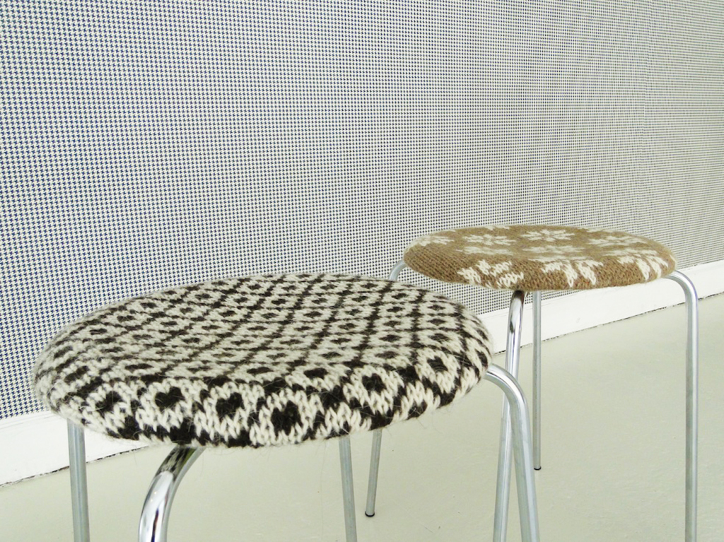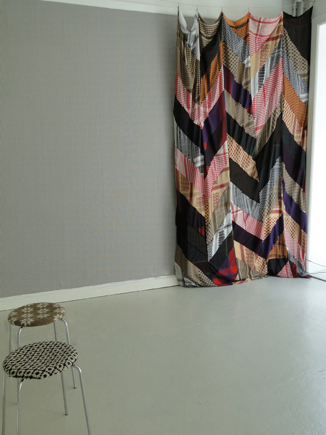 A community arises and its identity is supported by folk costumes and local patterns. In the artwork and exhibition, SO CLOSE, this local identity is linked to the global, at times contradictory symbolism, which is also true of the partisan scarf. It is partly used today by fashion-conscious young people as just another garment in the wardrobe, and yet many people throughout the world continue to wear this checkered scarf as a political statement. The work is an investigation into the meanings that popular symbols, objects and textiles can have. This is also evident in the other works in the exhibition, which show the drift of different patterns from being a traditional, local form to becoming an international fashion trend, mass produced for example in China or Bangladesh. In the work Plane Symmetry, the wall is covered by Ralph Lauren's "Bradford Check" wallpaper with Houndstooth pattern. The pattern was used in woollen textiles in Scotland in the 1800s and has gained great popularity in the fashion world. Another wall is covered by the work, Folk Fashion Curtain, a curtain made of partisan scarves and scarves from traditional Danish folk-costumes sewn together. The artist's interest in these folk symbols is clearly revealed and continues to be seen in the work, So Chic, which consists of two Arne Jacobsen Dot stools, covered with Faroese style knitting; a pattern that reflects the political relationship between Denmark and the Faroe Islands, and the value we place on the local craftwork. Many variations of checks are shown side by side creating a room that is a tandem of local and global symbols, each presenting their material and social status. Each pattern tells a tale of original, local identity, which has become today a globalised identity. The works and exhibition also pose a number of questions, such as: Can identity be bought? Who is included and who is excluded in these visual communities? What relationship has the wearer of the scarf to its origins?